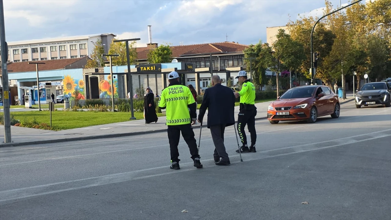 Bursa'da trafik polisleri, koltuk değnekleriyle yolun karşısına geçmekte zorlanan yaşlı adama yardımcı oldu.