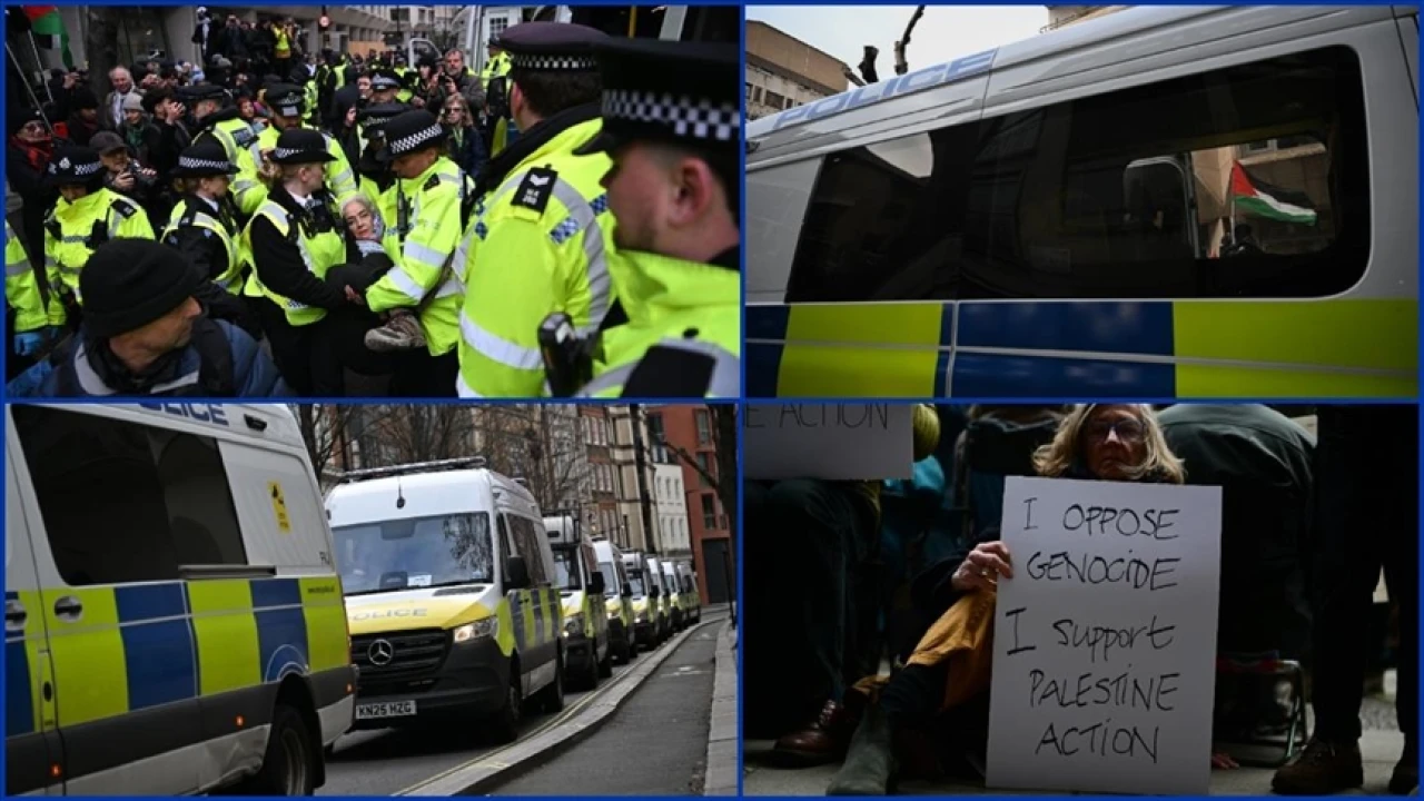 Yaklaşık 100 kişinin katıldığı gösteride protestocular, boş karton ve pankartlarla 'Soykırıma karşıyım, Palestine Action'ı destekliyorum' mesajı verdi. Eylemcilerden bazıları, kendilerini oturma eylemi yaparak gözaltına aldırdı.
