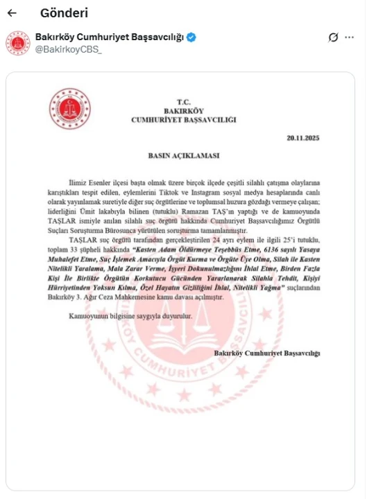 İstanbul'da farklı ilçelerde silahlı çatışmalarla bağlantılı olduğu belirtilen Taşlar suç örgütüne yönelik soruşturma tamamlandı. Bakırköy Cumhuriyet Başsavcılığı tarafından yürütülen soruşturma sonucunda 25'i tutuklu toplam 33 şüpheli hakkında Ağır Ceza Mahkemesi'nde kamu davası açıldı.